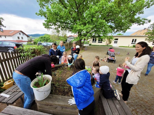 Am 24.5.23 trafen sich 15 Kinder zum bepflanzen des Hochbeets in der Schule.